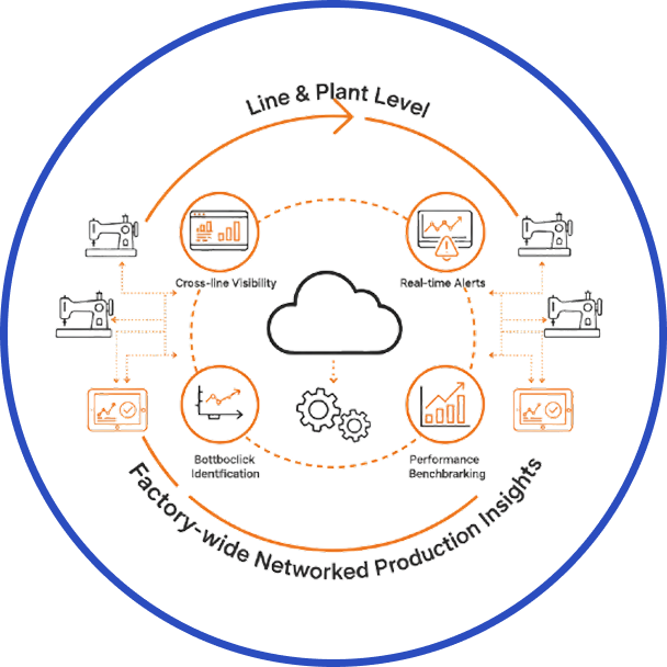 Evoluzn’s IIoT-enabled garment stitching solution empowers your factory to unlock smarter production with comprehensive, real-time operational intelligence across machines and infrastructure. Designed in close collaboration with industry leaders, our solution helps you reduce downtime, boost productivity, enhance quality, and cut energy costs—transforming traditional stitching floors into tightly managed, data-driven smart factories.